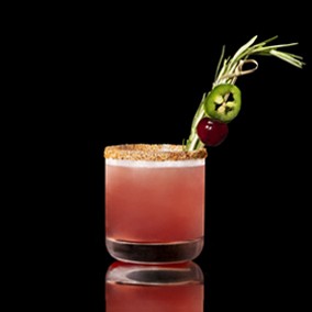 Garnish with cherry, jalapeño, and rosemary sprig with Tajín rim.